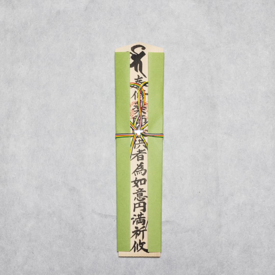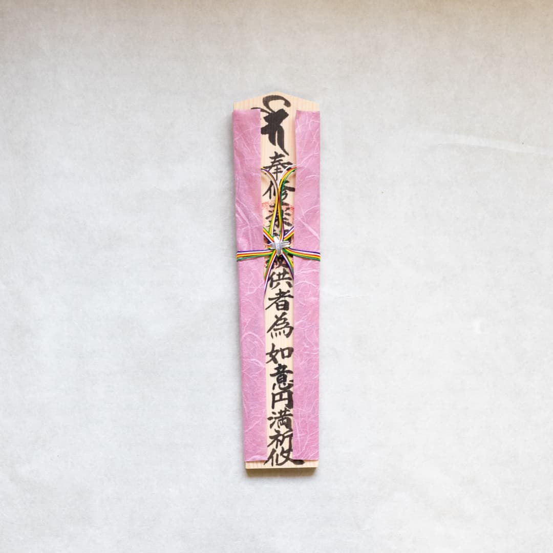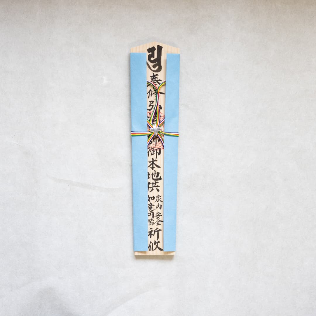 木札の袴には、徳島の伝統工芸品である阿波和紙を使用しています。 その色は全22色。金・銀・檜皮色・香色など、一つひとつ丁寧に選び抜いた美しい色合いをご用意しました。 また、カードお札のデザインは住職がすべて手がけています。
